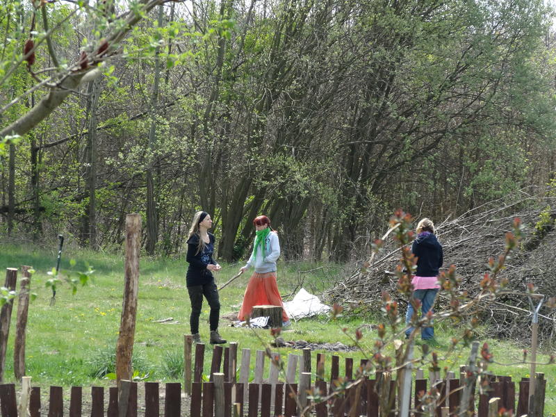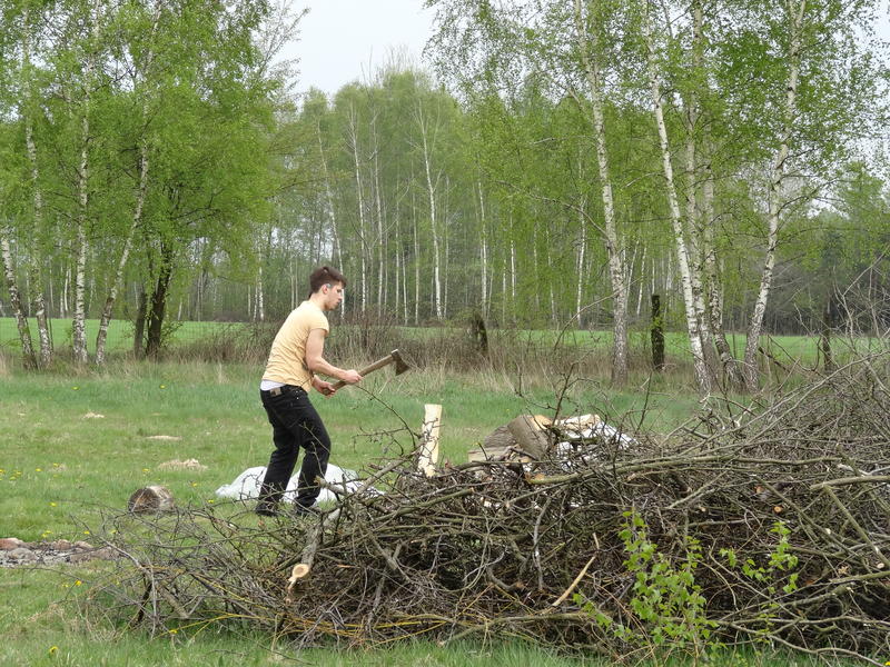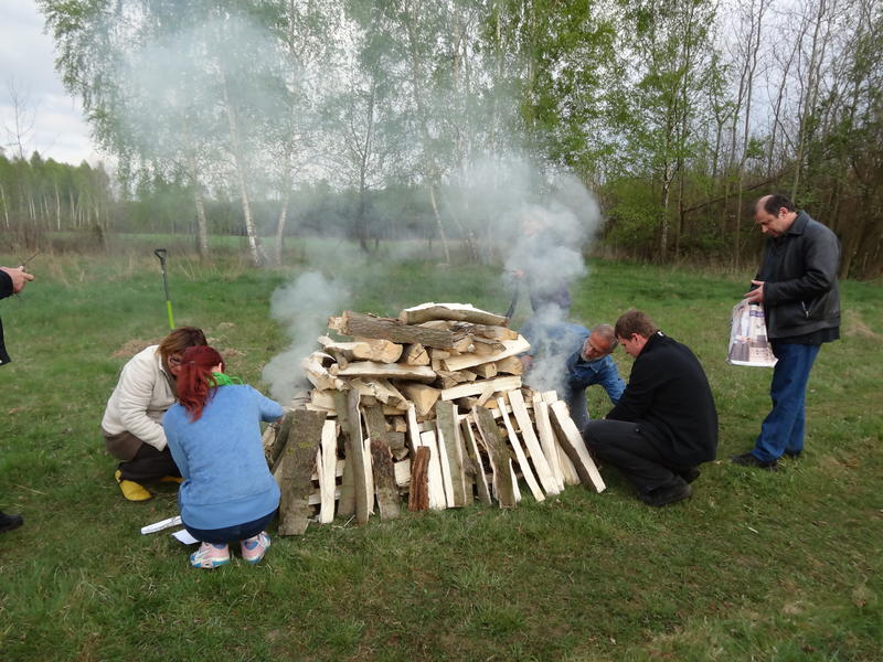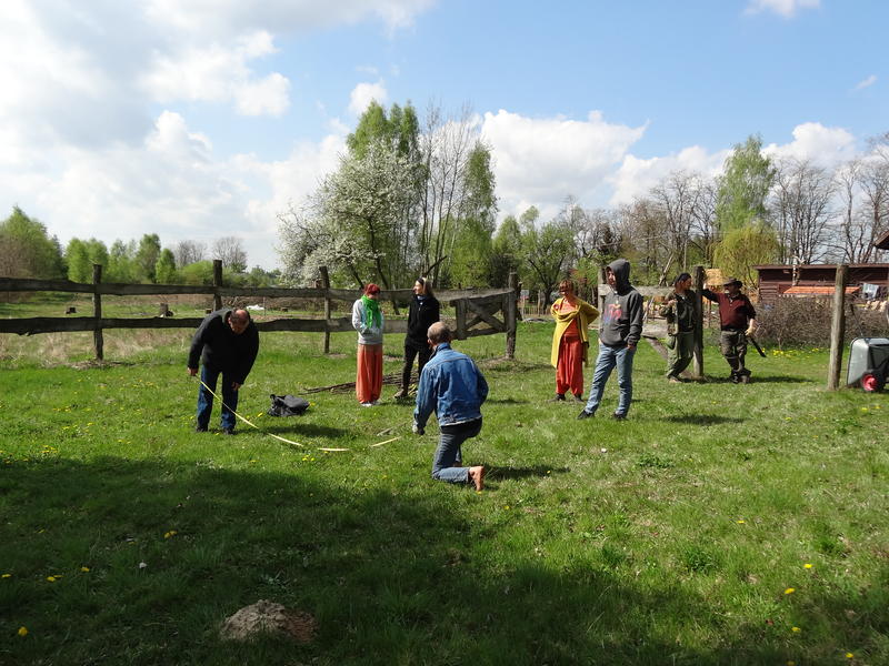 Po obiedzie zabraliśmy się za budowę ogniska do chodzenia po ogniu. Mieliśmy trochę drewna do porąbania, z którym Maciek z Bogdanem szybko się uporali. Dziewczyny przyniosły z lasu trochę cienkich gałęzi na rozpałkę. Gdy już wszystko było gotowe, to zrobiliśmy kilka ćwiczeń, które miały nas przygotować do przejścia po ścieżce ognia. Jednym z takich ćwiczeń był bieg do głosu z zawiązanymi oczami.